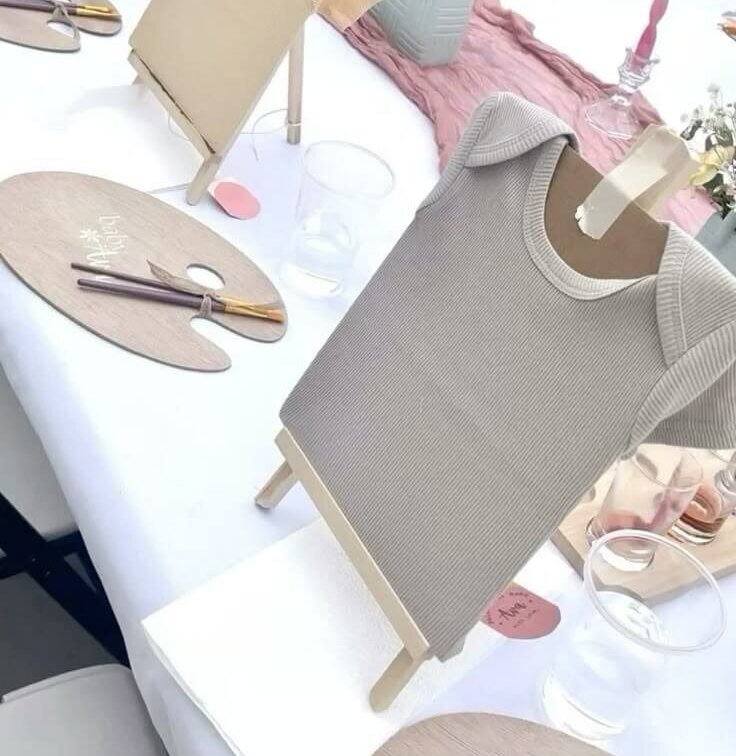 - Malowanie ubranek dziecięcych – ustaw stanowiska z farbami, markerami lub pastelami do tekstyliów oraz jednolitymi body, lub śliniaczkami. Niech każdy z gości ozdobi ubranko dla maluszka. W ten sposób jego pierwsza kolekcja ubranek będzie zaprojektowana przez najbardziej kochających go ludzi.