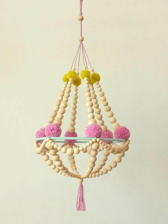 - Girlandy z pomponów i koralików filcowych – miękkie i kolorowe, które można połączyć z drewnianymi koralikami dla ciekawego efektu.