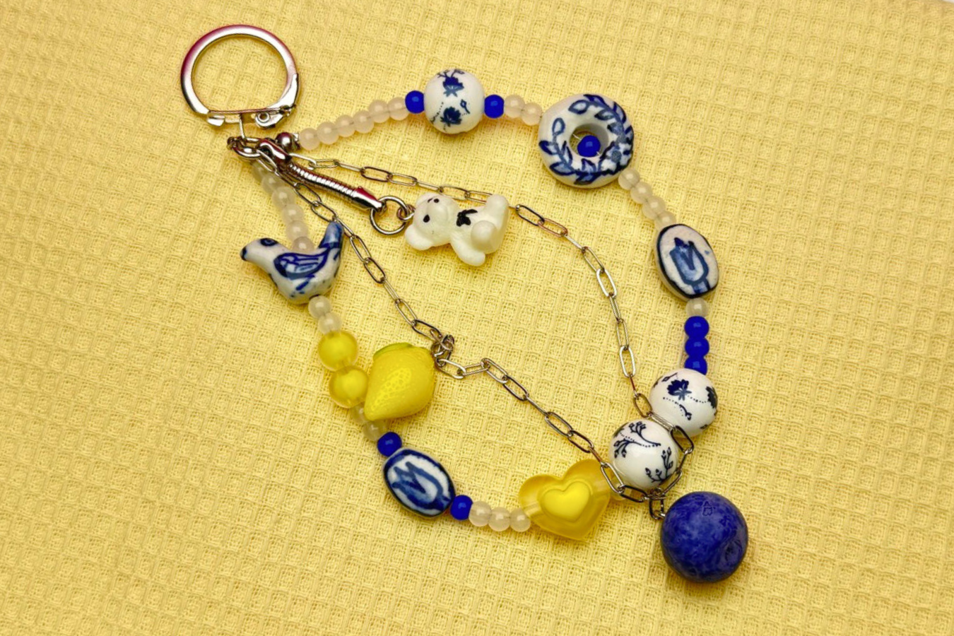 Poniżej znajdziecie listę produktów, których użyłam w tym projekcie. Ja, decydując się na styl grecki, postawiłam na połączenie bieli, ciemnego niebieskiego oraz żółtego, które razem tworzą świeżą, letnią kompozycję. Całość uzupełniłam ceramicznymi koralikami z delikatnymi wzorami oraz różnorodnymi zawieszkami, które nadają brelokowi lekkości i charakteru.