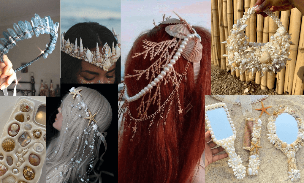 Nie można pominąć dodatków użytkowych. Ozdobne grzebienie do włosów i lusterka, bogato wyklejane prawdziwymi muszlami, perłami akrylowymi i błyszczącymi kryształkami. Takie robią ogromne wrażenie – doskonałe do toaletki każdej współczesnej morsko-mistycznej duszy.