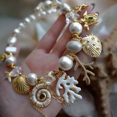 Nieodłącznym elementem stylu morskiej wiedźmy jest ręcznie robiona biżuteria – magiczna, bogata w znaczenie i surowce naturalne. Mimo pozornie surowego uroku, jej tworzenie to doskonałe pole kreatywności. Głównymi materiałami, które pozwolą stworzyć wyjątkowe ozdoby w duchu Sea Witchery są: muszelki, perły, zarówno naturalne, jak i perły akrylowe, a także koraliki i koraliki akrylowe. Używa się także drutu jubilerskiego oraz żyłki, która delikatnie eksponuje zawieszki imitujące podwodne skarby.